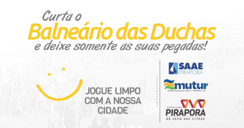 Em decorrência disso, a partir dessa semana, por meio da junção de esforços da Prefeitura de Pirapora, Emutur e SAAE, foi lançada a campanha: Jogue limpe com a nossa cidade. O objetivo é, por meio de materiais educativos que serão distribuídos e disponibilizados na área das duchas, conscientizar e cultuar nos piraporenses e visitantes a importância que todos têm, na manutenção de um ambiente limpo, seguro e agradável no balneário e em toda a cidade.