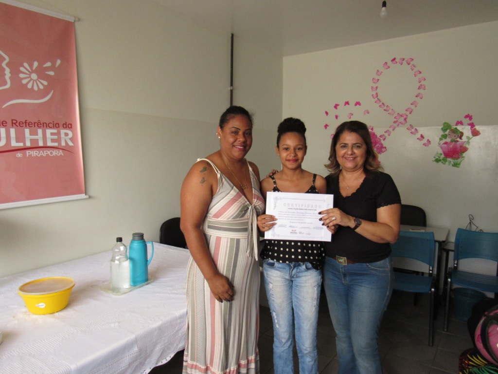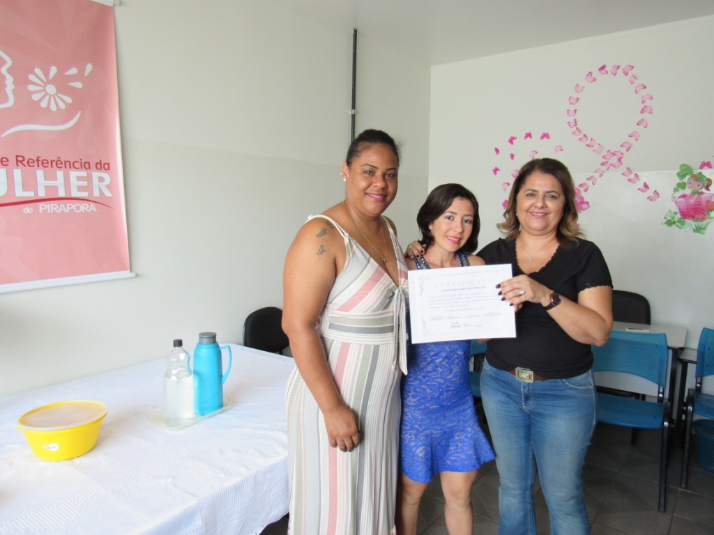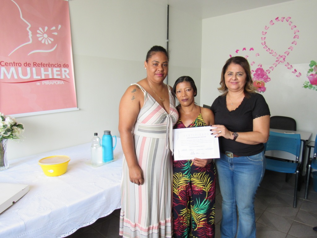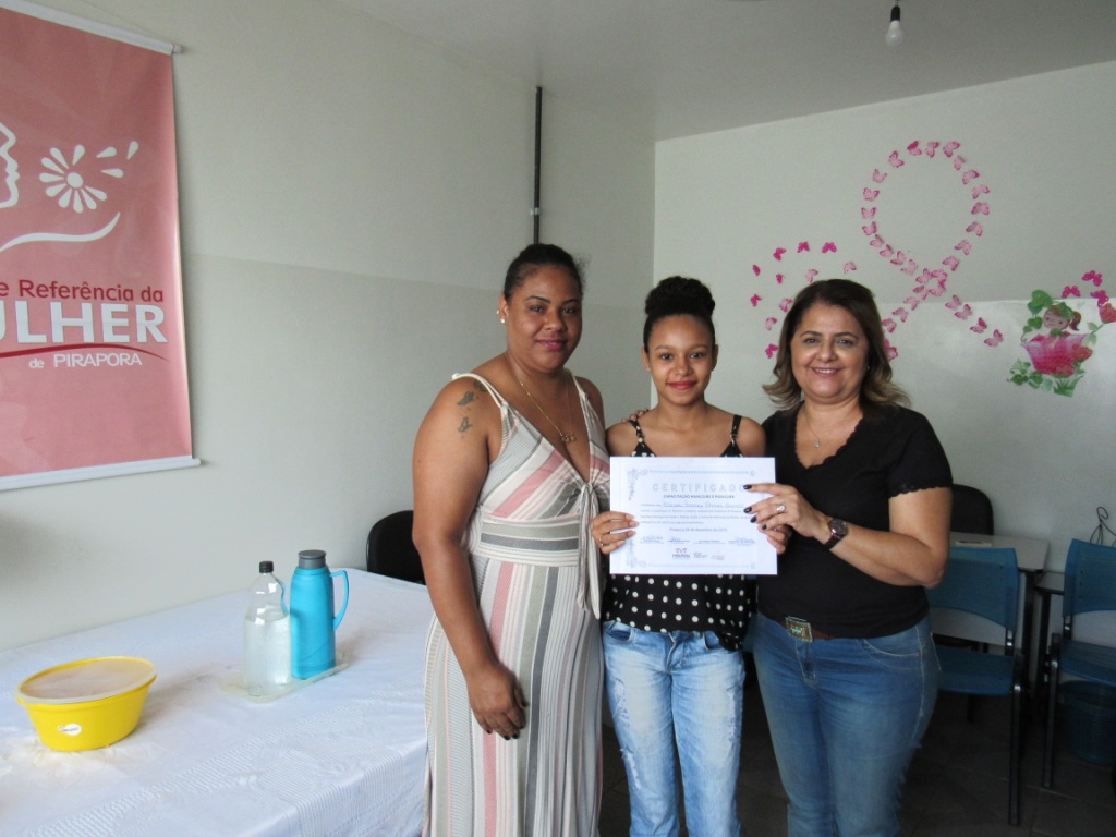 A prefeitura de Pirapora certificou mais uma turma de alunas dos cursos profissionalizantes realizados pelo Centro de Referência da Mulher (CREMP). O encerramento do curso contou com a presença das alunas, a presidente do Conselho Municipal dos Direitos da Mulher, Kenia Maria Barros; a técnica de referência do CREMP, Cristiane Ramos; as técnicas do CREMP Rozany Cota e Edna Soares; a professora Daiane Rezende de Souza.