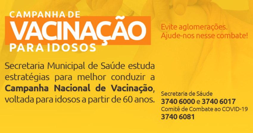 A Prefeitura de Pirapora através da Secretaria de Saúde informa que está adotando estratégias para a Campanha Nacional de Vacinação. As medidas adotadas serão para garantir o melhor funcionamento da campanha para os idosos a partir dos 60 anos.