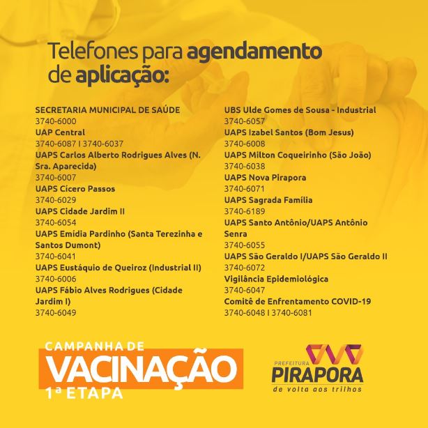 Essa primeira fase da vacinação vai até 15 de abril, neste período as Unidades de Saúde funcionarão de 07h às 11:00 e de 13h às 17:00. No dia agendado para a aplicaçãoo idoso deverá comparecer a unidade de saúde e apresentar documento pessoal e o cartão vacinal.