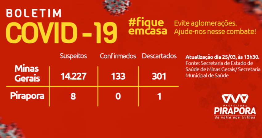 Boletim da Secretaria Estadual de Saúde atualizou hoje, para nove (09) casos suspeitos de COVID-19, coronavírus, em Pirapora.