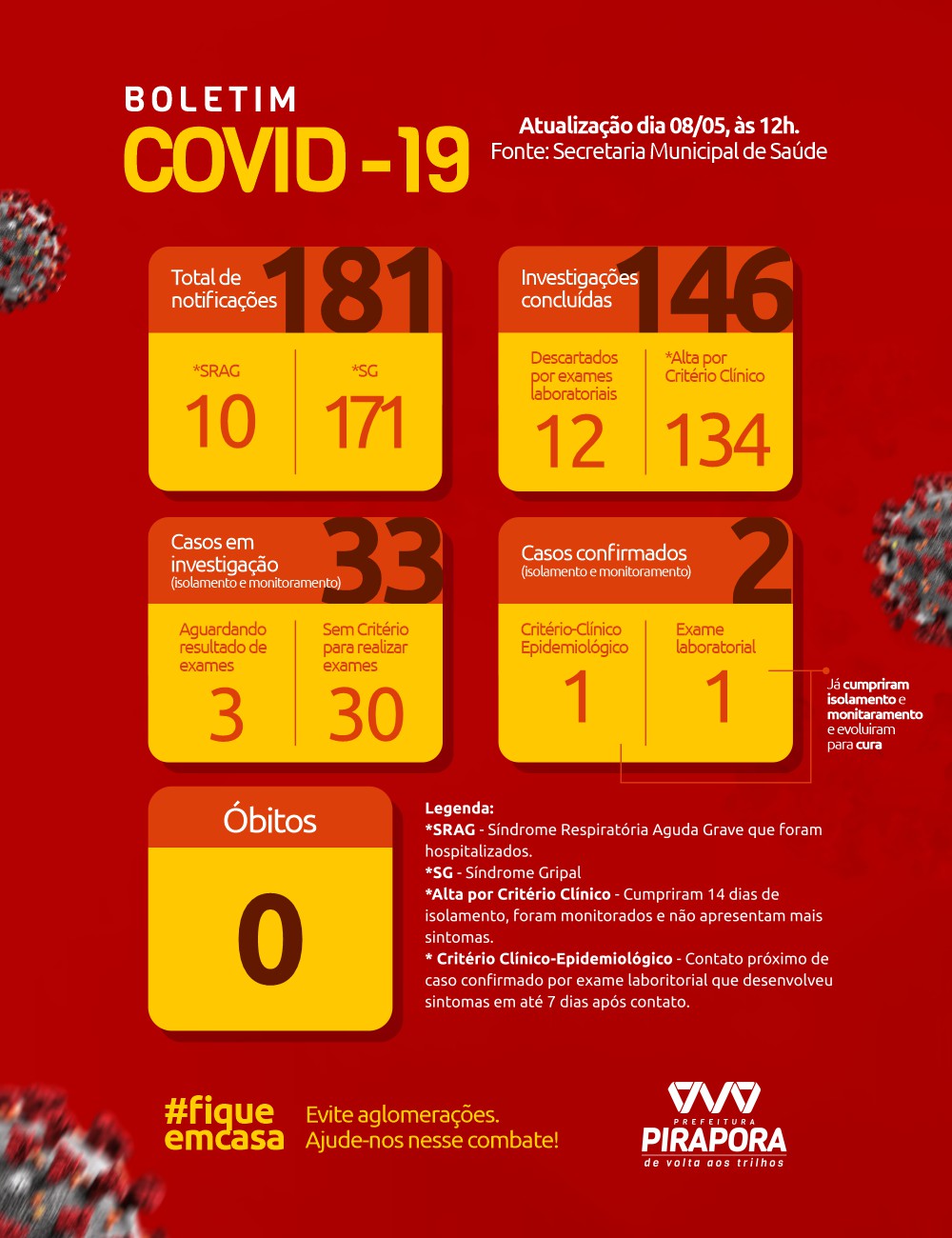 A Secretaria de Saúde divulga nesta sexta-feita (08/05), 181 casos notificados, desses, 134 já tiveram alta por critério clínico e 12 foram descartados por exames laboratoriais. Os casos confirmados já cumpriram os protocolos de isolamento e foram considerados curados. Veja o Boletim completo na imagem abaixo.