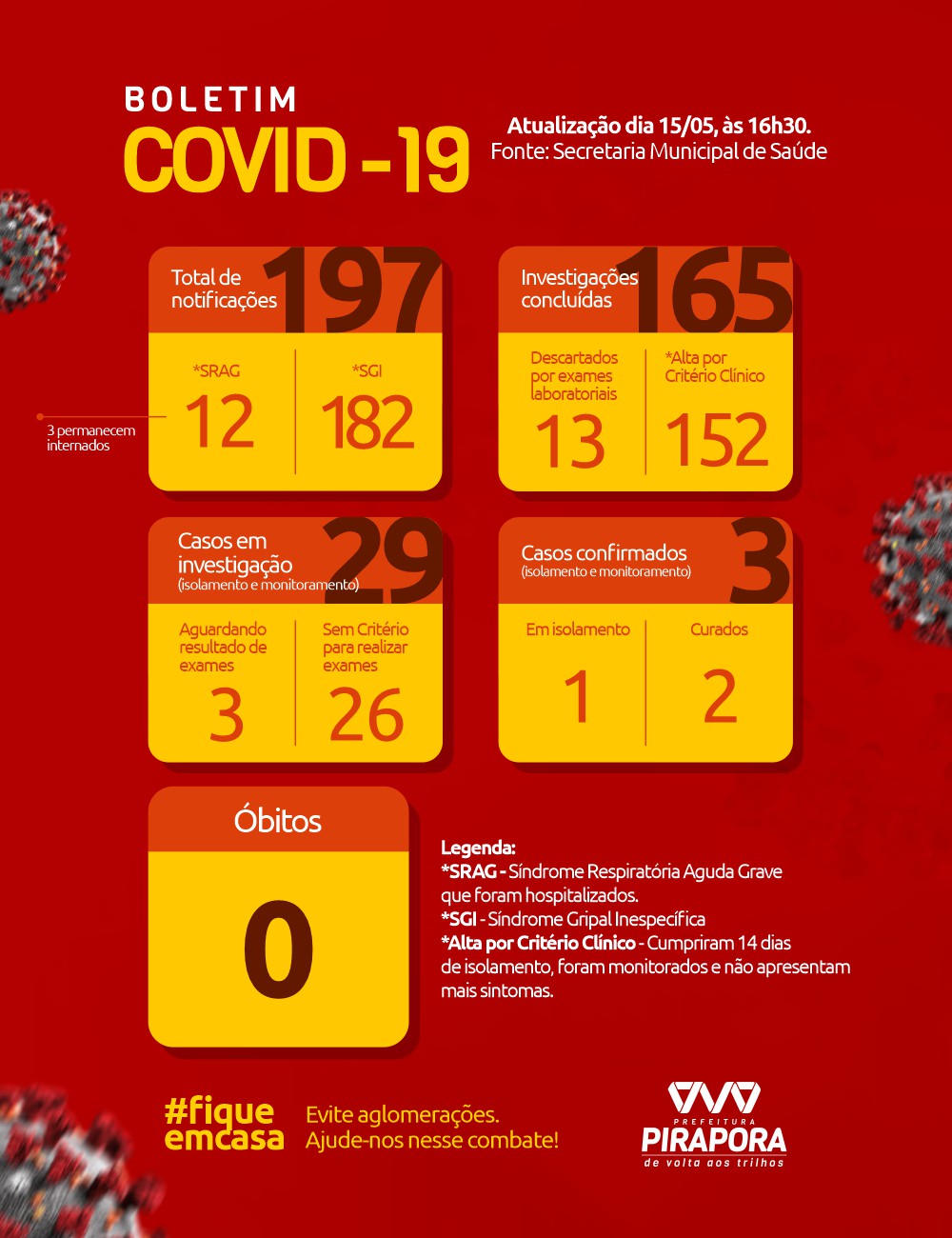 A Prefeitura de Pirapora, através do Comitê de Enfrentamento ao COVID-19 confirma na tarde desta sexta-feira (15/05), o terceiro caso de coronarívus. O homem de 53 anos, que não apresenta fator de risco testou positivo por teste rápido e está em monitoramento pelas equipes de saúde.