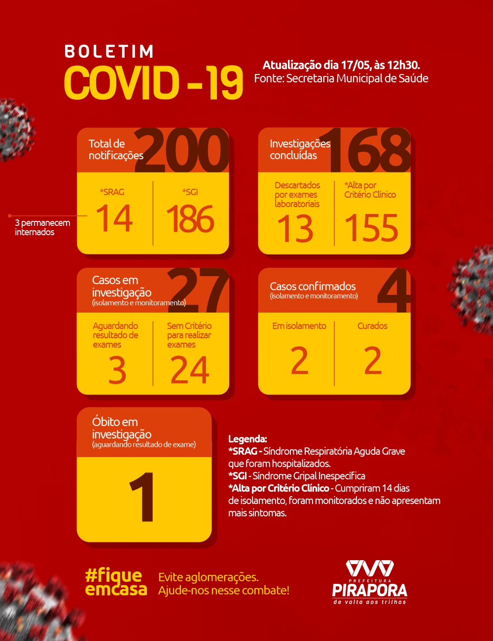 A Secretaria Municipal de Saúde divulga neste domingo (17/05), o Boletim atualizado da COVID-19. Até o momento são 200 casos notificados, com 168 casos concluídos, 27 casos em investigação e quatro (04) casos confirmados. Desses casos confirmados, dois (02) estão curados, um (01) em isolamento e um (01) internado. Veja, abaixo, os dados do Boletim.