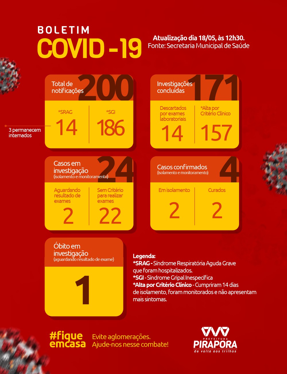 A Prefeitura de Pirapora, através da Secretaria Municipal de Saúde divulga nesta segunda-feira (18/05), o Boletim atualizado da COVID-19. São 200 casos notificados, com 171 casos concluídos, 24 casos em investigação e quatro (04) casos confirmados. Constam, ainda, um (01) caso em isolamento e um (01) internado. Veja, abaixo, os dados do Boletim.