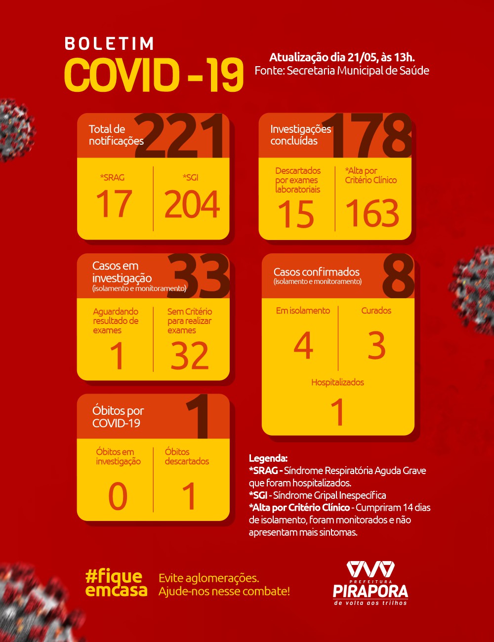 Desta forma, agora são oito (08) casos confirmados e um (01) óbito. A Prefeitura de Pirapora lamenta a perda e se sensibiliza com todos os familiares.