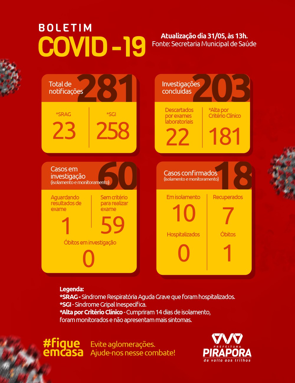 A Secretaria de Saúde de Pirapora, através do Comitê de Enfrentamento ao Covid-19 divulga o Boletim deste domingo (31/05).