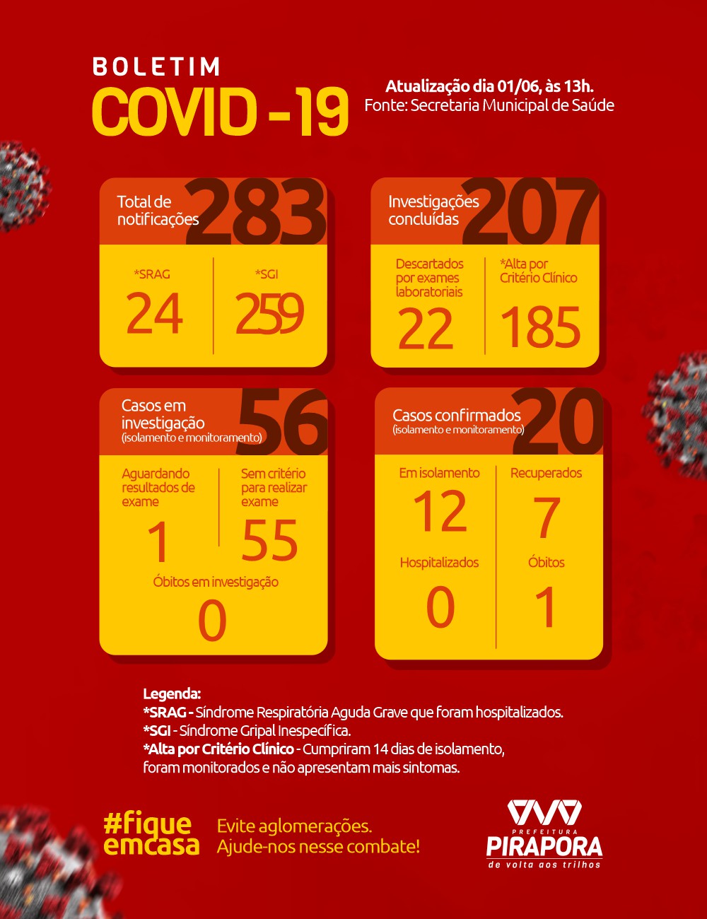 O Comitê de Enfrentamento ao COVID-19 de Pirapora divulga o Boletim desta segunda-feira (01/06) confirmando mais dois (02) casos para a COVID-19 em Pirapora. Uma (01) mulher, 32 anos e um (01) homem, 29 anos. Uma equipe de saúde monitora o casal, que está em isolamento domiciliar.