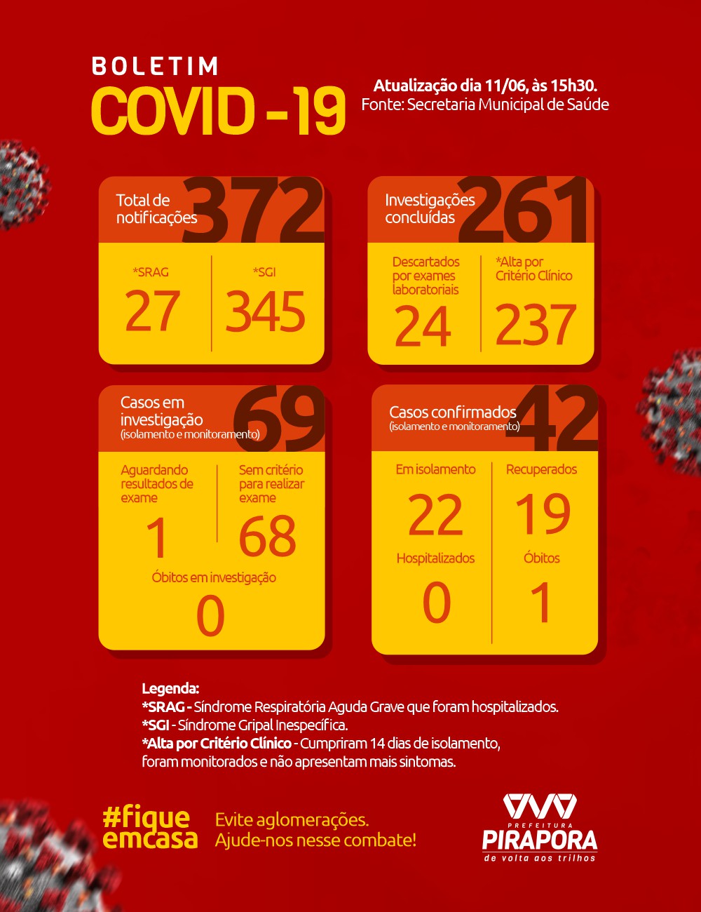Até o momento são 372 notificados, 261 casos concluídos e 69 em investigação. Veja o Boletim completo abaixo.