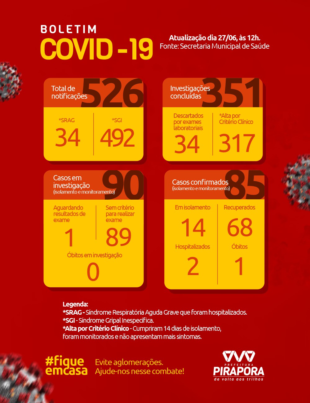 O boletim completo traz 526 casos notificados, 351 investigações concluídas, 90 casos em investigação e 85 confirmados. Para mais detalhes, veja o boletim completo.