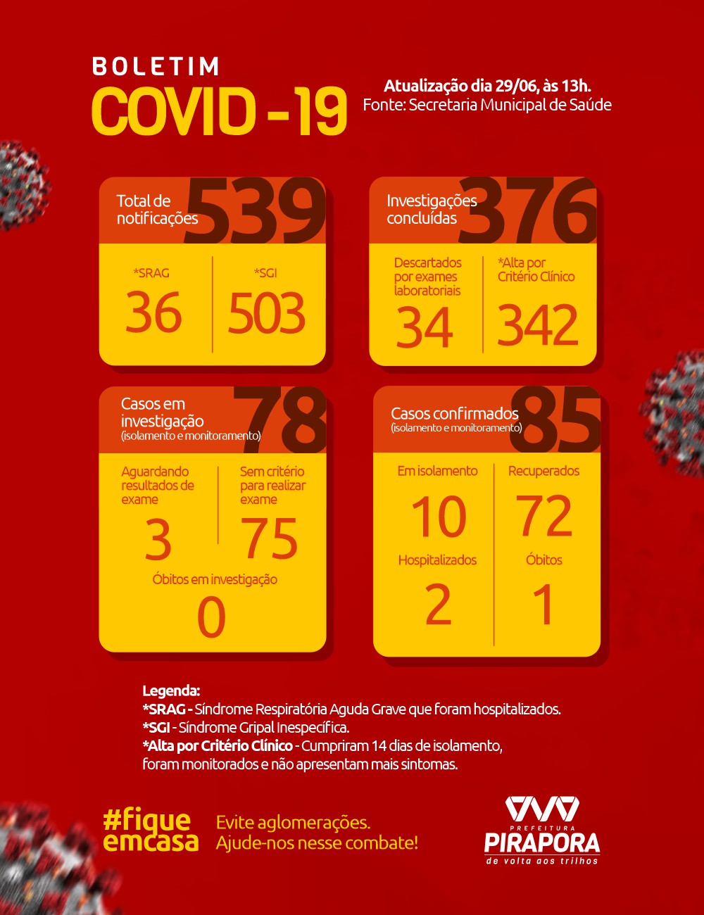 A Prefeitura de Pirapora, através da Secretaria Municipal de Saúde divulga o Boletim desta segunda-feira (29/06), sem nenhum caso testado positivo. Destaque para o número de recuperados chegando a 85% dos casos confirmados.