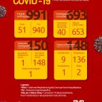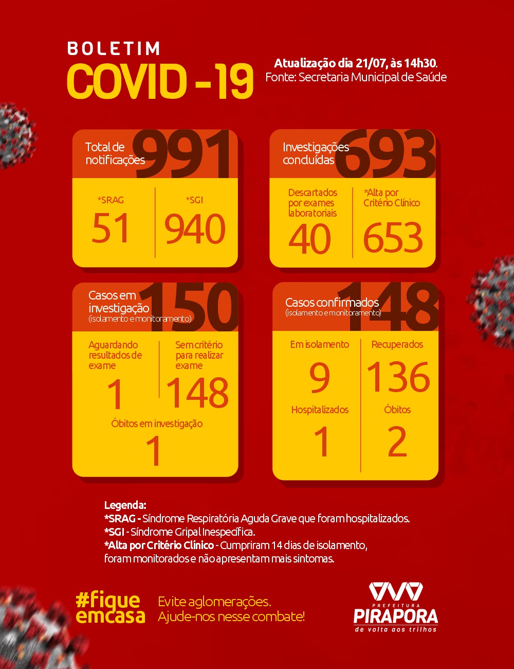 O boletim completo traz 991 casos notificados, 693 concluídos, 150 casos em investigação e 148 confirmados. Desses casos confirmados, nove estão em isolamento e monitoramento, 136 recuperados, um hospitalizado e dois óbitos.