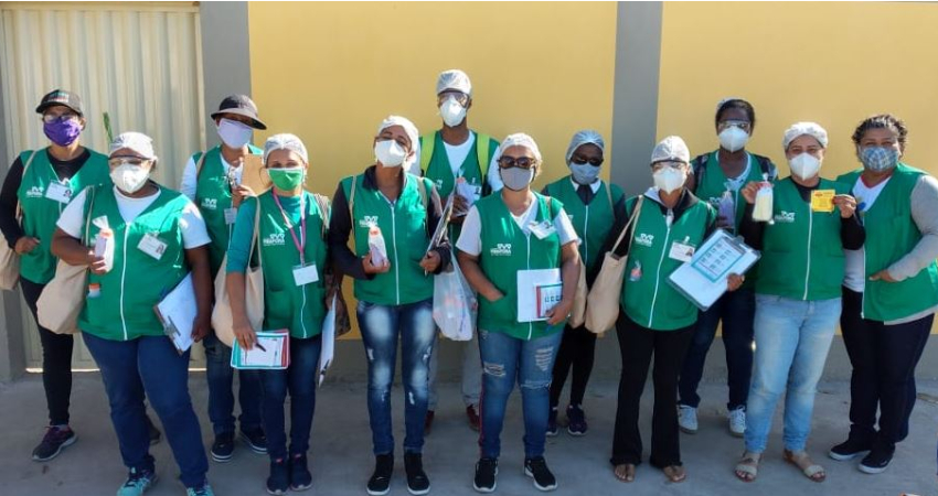 Ao mesmo tempo, as equipes de Vigilância em Saúde orientam às pessoas com entrega de panfletos e kits, contendo álcool gel e máscara.