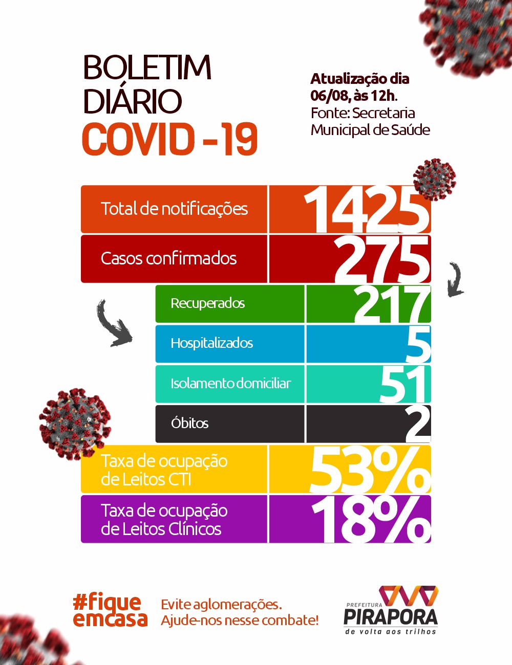 O boletim completo traz 1.425 casos notificados, 275 casos confirmados, que desses, 51 estão em isolamento e monitoramento, 217 recuperados, cinco hospitalizados e dois óbitos.