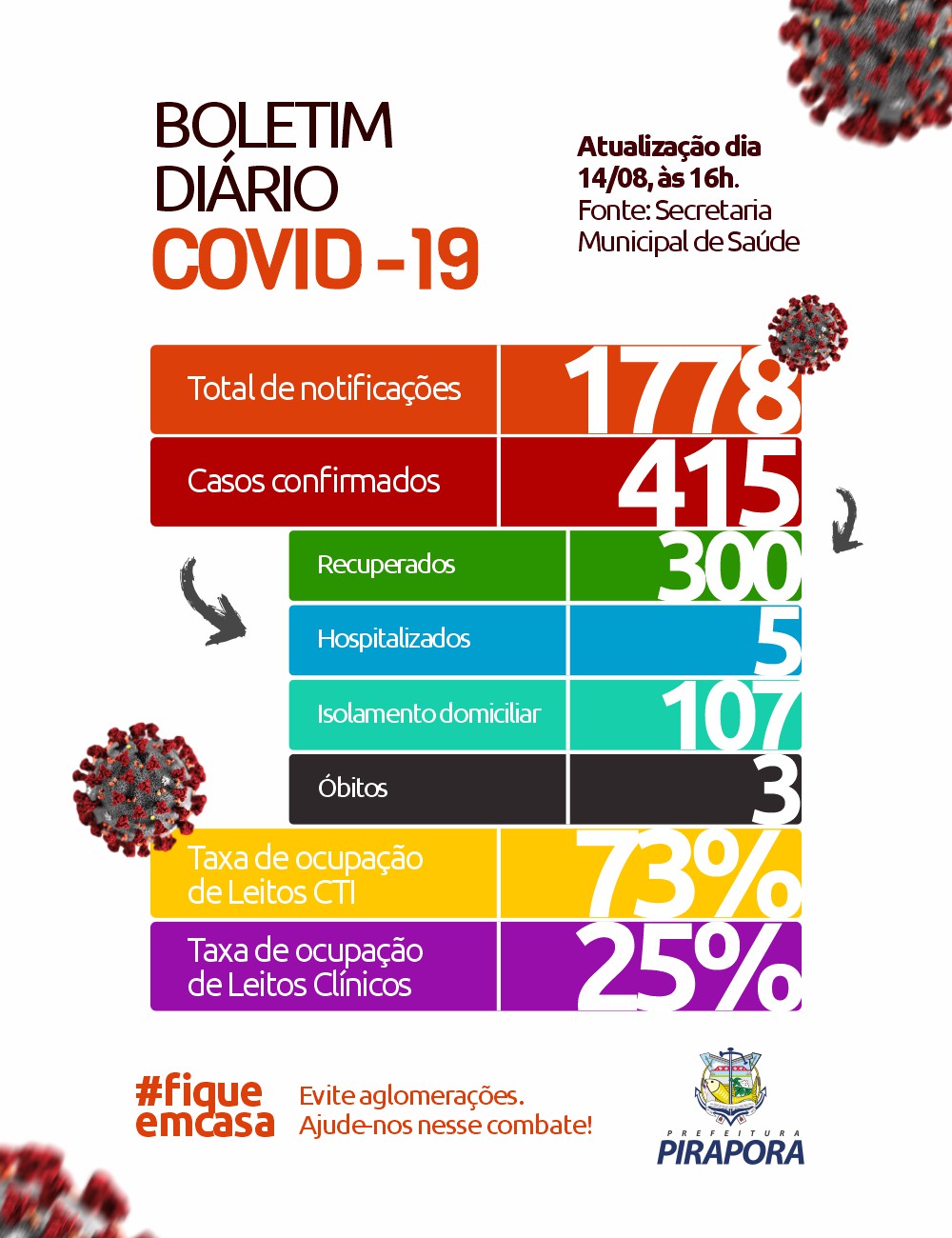 O boletim completo traz 1.778 casos notificados, 415 casos confirmados, sendo 107 em isolamento e monitoramento, 300 recuperados, cinco hospitalizados e três óbitos.