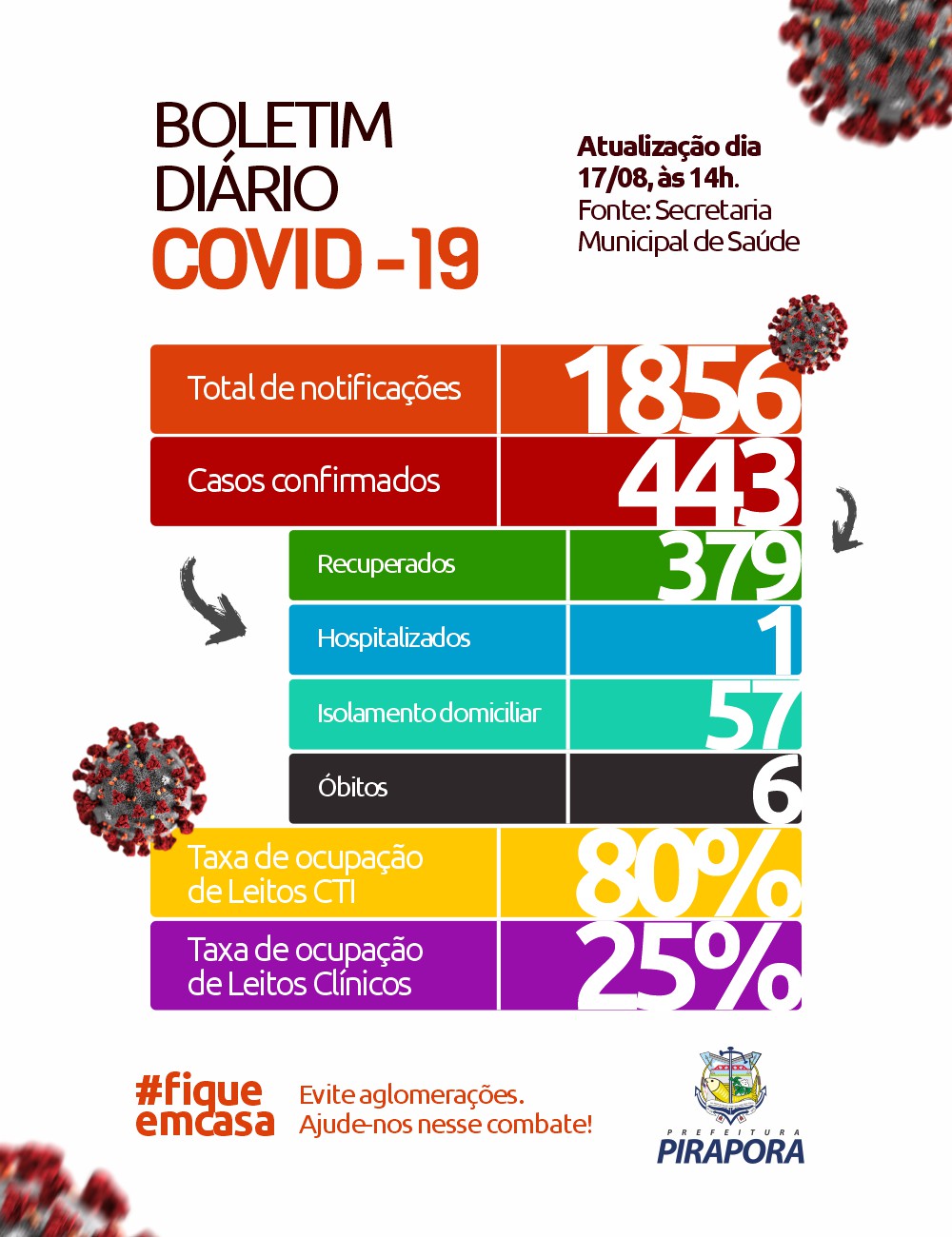 O boletim completo traz 1.856 casos notificados, 443 casos confirmados, com 57 em isolamento e monitoramento, 379 recuperados, um hospitalizado e seis óbitos.