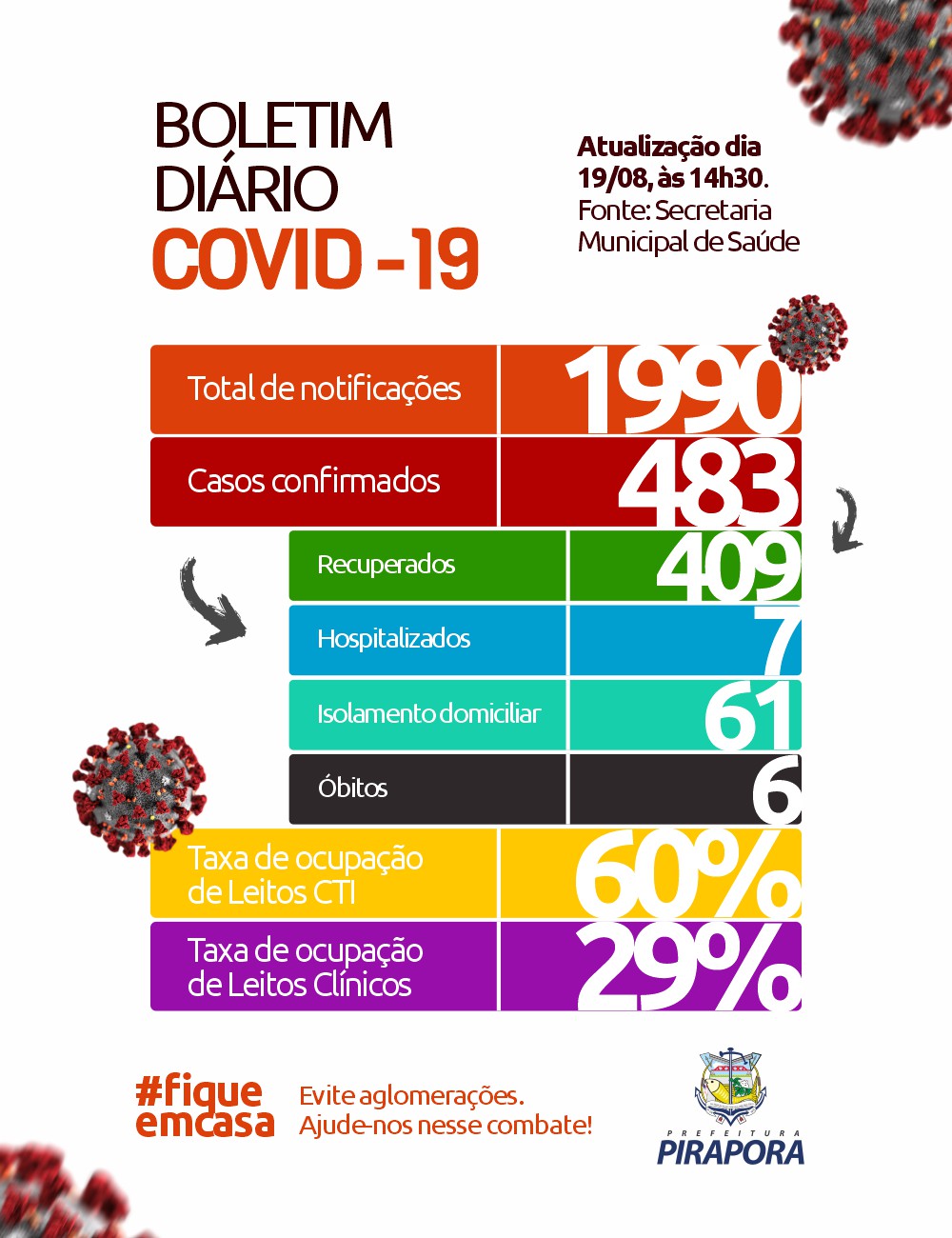 O boletim completo traz 1.990 casos notificados, 483 casos confirmados, com 61 em isolamento e monitoramento, 409 recuperados, sete pessoas hospitalizadas e seis óbitos.