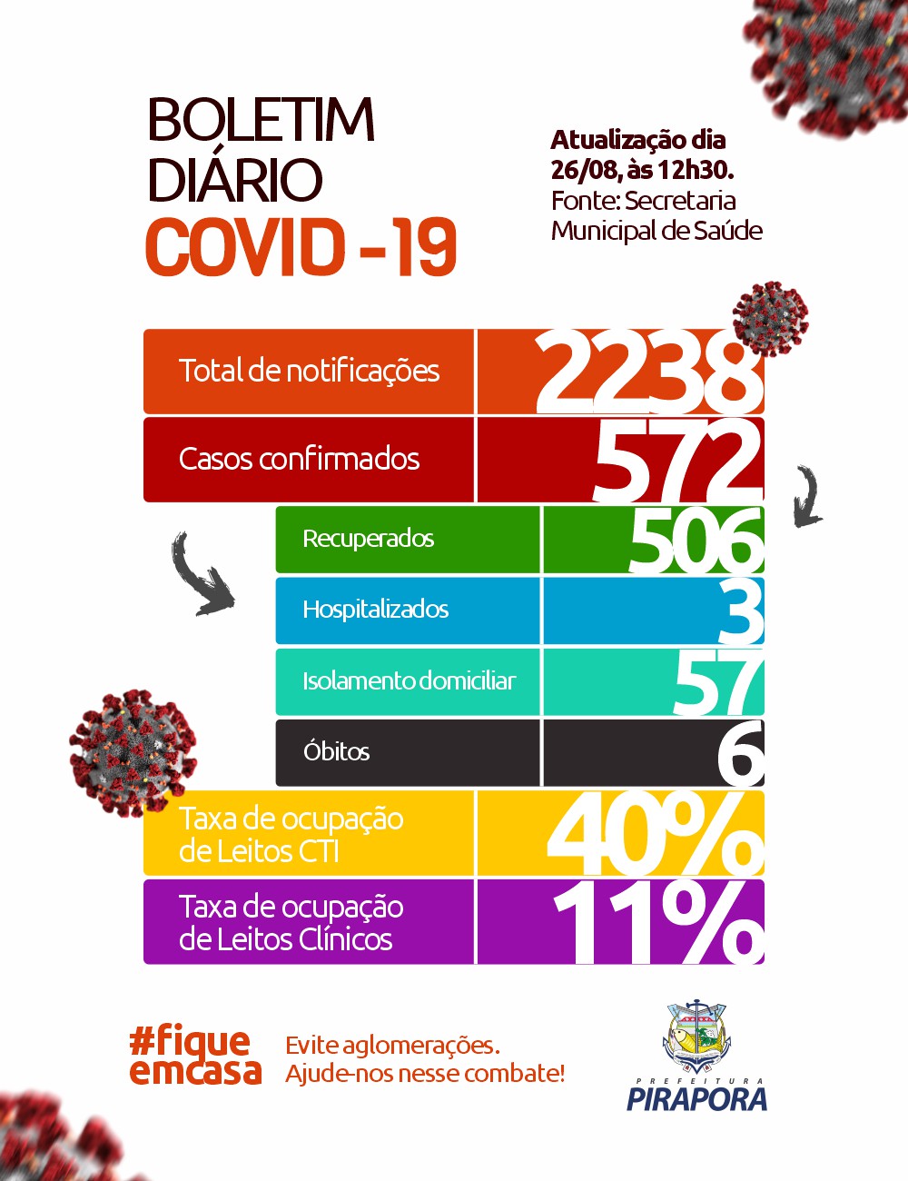 O boletim completo traz 2.238 casos notificados, 572 casos confirmados, com 57 em isolamento e monitoramento, 506 recuperados, 03 hospitalizados e 06 óbitos.