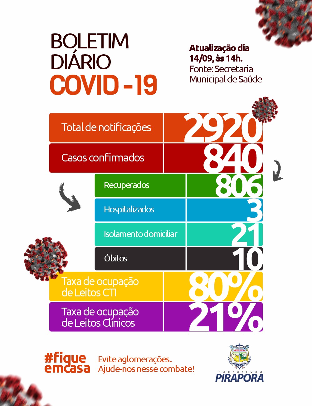 O boletim completo traz 2.920 casos notificados, 840 casos confirmados, com 21 em isolamento e monitoramento, 806 recuperados, 03 hospitalizados e 10 óbitos.
