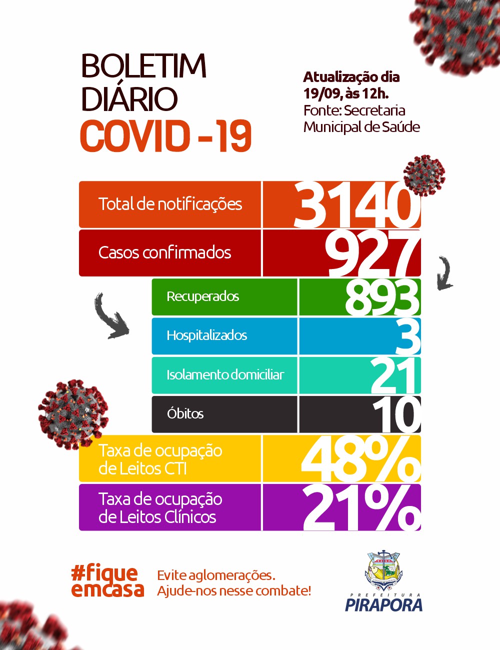 O boletim completo traz 3.140 casos notificados, 927 casos confirmados, com 21 em isolamento e monitoramento, 893 recuperados, 03 hospitalizados e 10 óbitos.