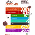 O boletim completo traz 3.381 casos notificados, 1015 casos confirmados, com 27 em isolamento e monitoramento, 974 recuperados, 03 hospitalizados e 12 óbitos.