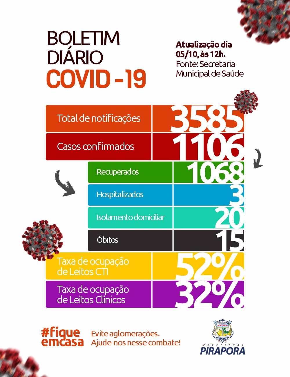 O boletim completo traz 3.585 casos notificados, 1.106 casos confirmados, com 20 em isolamento e monitoramento, 1.068 recuperados, 03 hospitalizados e 15 óbitos.