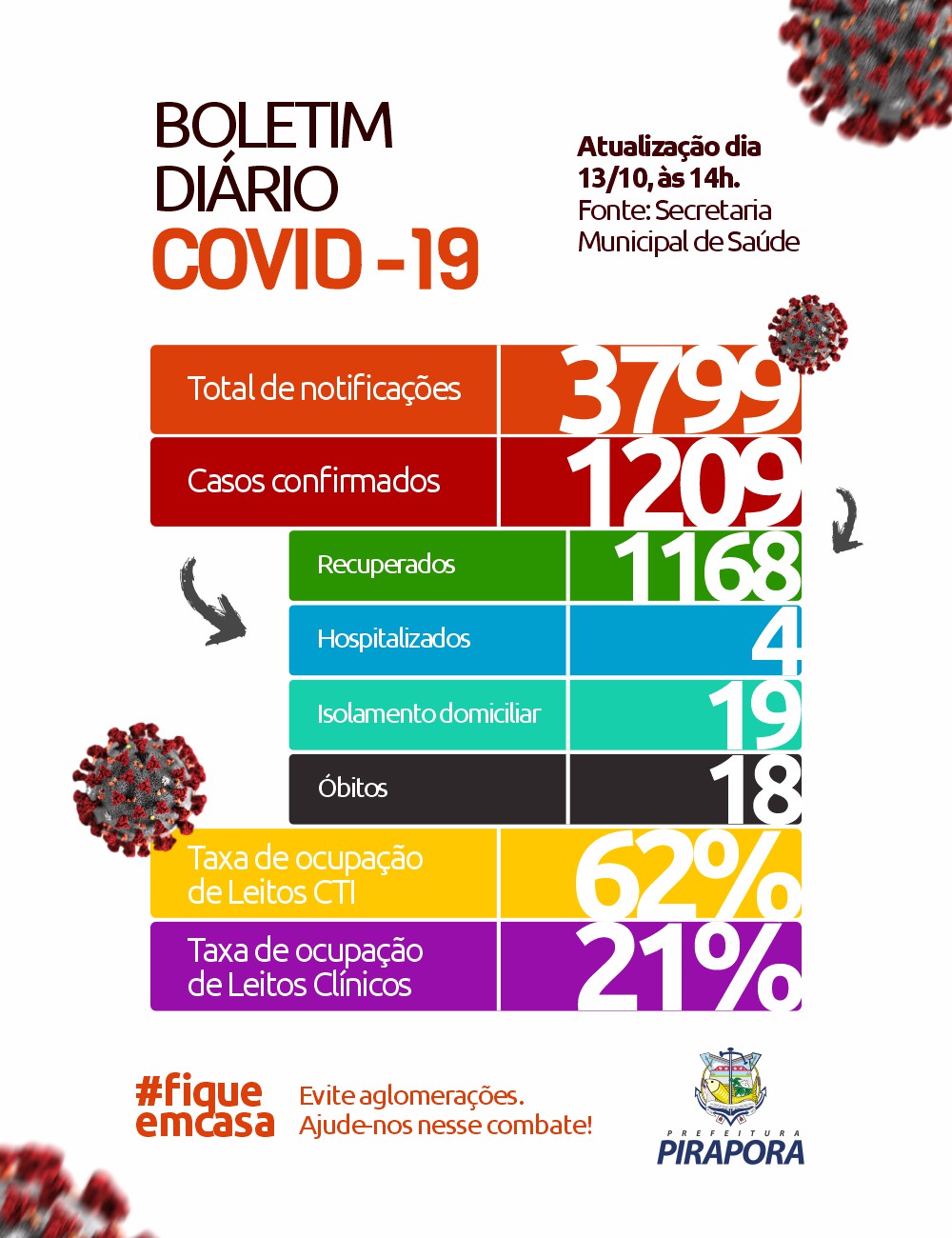 O boletim completo traz 3.799 casos notificados, 1.209 casos confirmados, com 19 em isolamento e monitoramento, 1.168 recuperados, 04 hospitalizados e 18 óbitos.