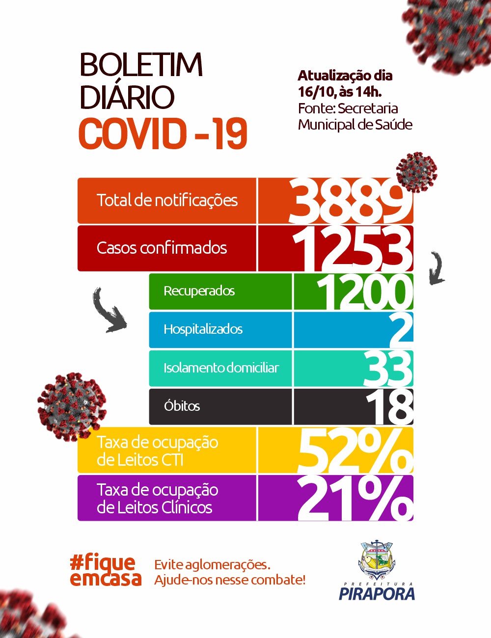 O boletim traz 3.889 casos notificados, 1.253 casos confirmados, com 33 em isolamento e monitoramento, 1.200 recuperados, 02 hospitalizados e 18 óbitos.