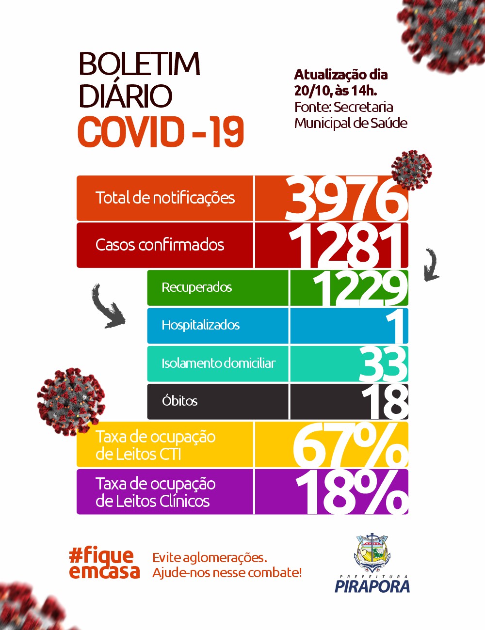 O boletim completo traz 3.976 casos notificados, 1.281 casos confirmados, com 33 em isolamento e monitoramento, 1.229 recuperados, 01 hospitalizados e 18 óbitos.