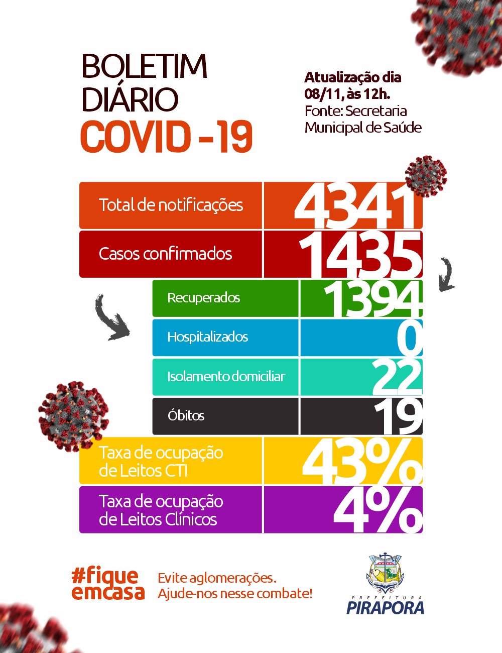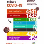 O boletim completo traz 4.341 casos notificados, 1.435 casos confirmados, com 22 em isolamento e monitoramento, 1.394 recuperados e 19 óbitos. Até o momento não há caso hospitalizado por Covid-19.