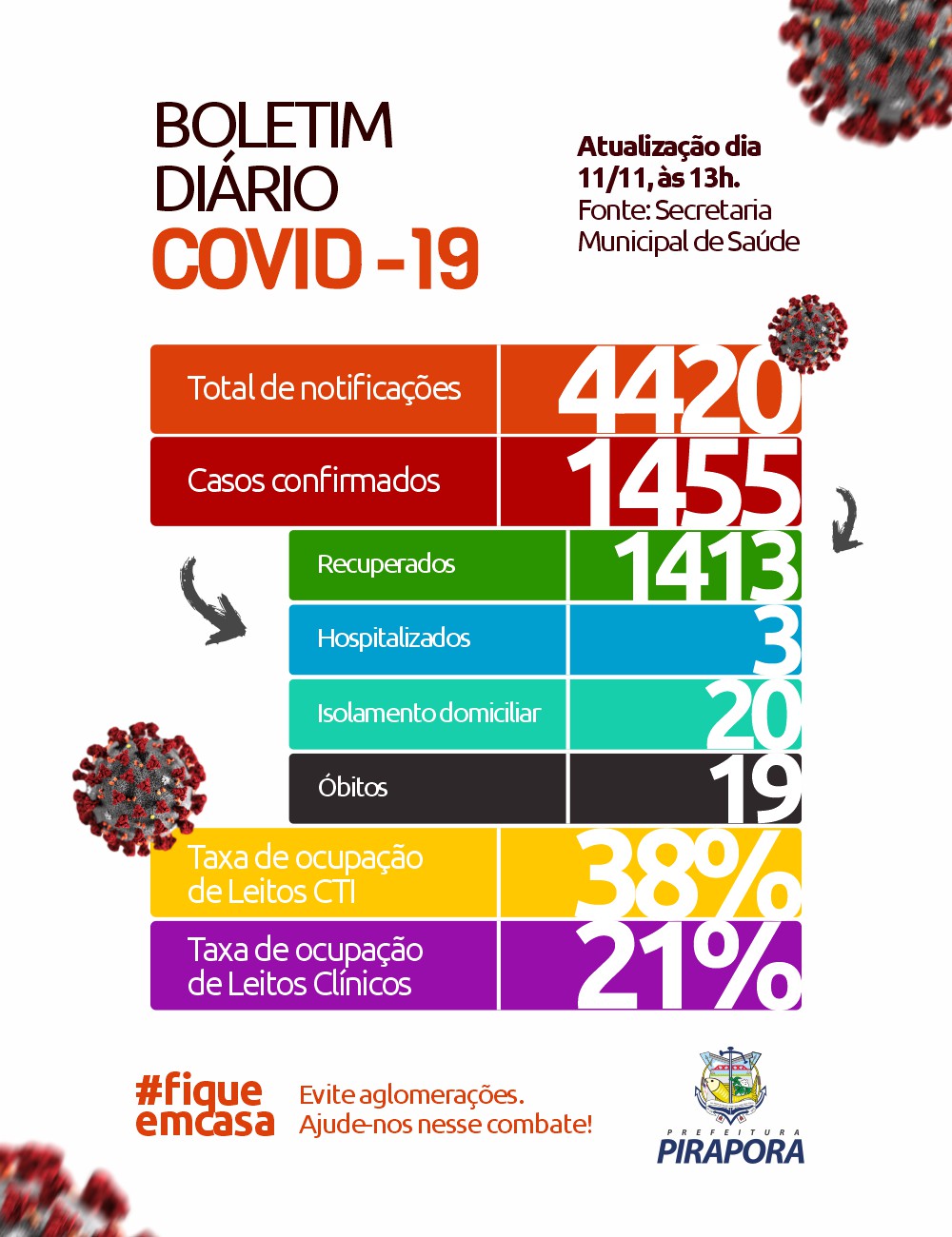 O boletim completo traz 4.420 casos notificados, 1.455 casos confirmados, com 20 em isolamento e monitoramento, 1.413 recuperados, 03 hospitalizados e 19 óbitos.