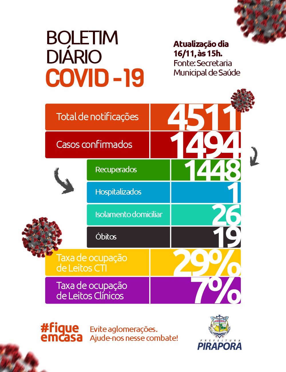 O boletim completo traz 4.511 casos notificados, 1.494 casos confirmados, com 26 em isolamento e monitoramento, 1.448 recuperados, 01 hospitalizado e 19 óbitos.