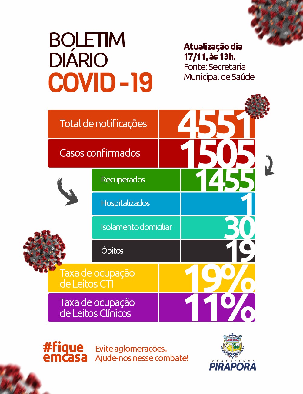 O Comitê Técnico da Covid-19 de Pirapora divulga o boletim desta terça-feira (17/11) com 11 casos para a Covid-19. São 07 mulheres e 04 homens.