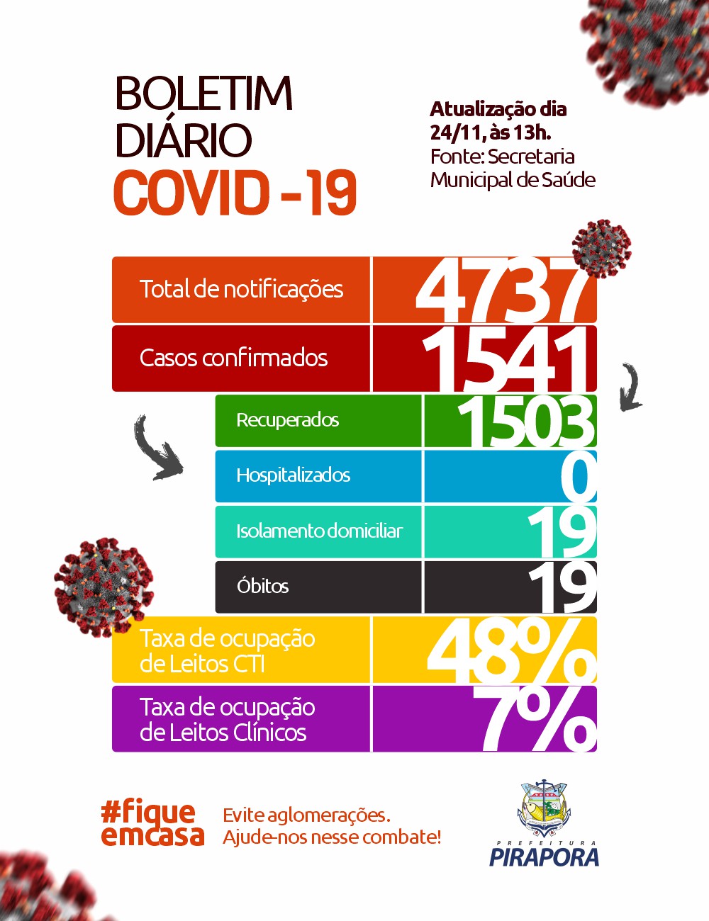 O boletim completo atualiza em 4.737 casos notificados, 1.541 casos confirmados, com 19 em isolamento e monitoramento, 1.503 recuperados e 19 óbitos. Não há paciente hospitalizado de Pirapora.