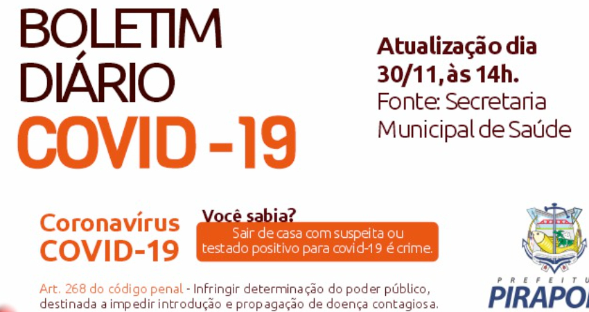 O Comitê Técnico de Enfrentamento da Covid-19 de Pirapora divulga o boletim desta segunda-feira (30/11), com 17 novos casos positivos para a covid-19.