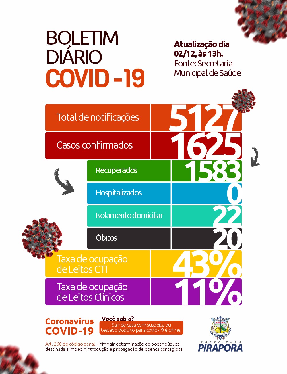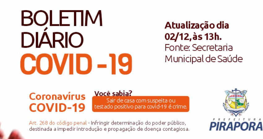 O Comitê Técnico de Enfrentamento da Covid-19 de Pirapora divulga o boletim desta quarta-feira (02/12), com 17 novos casos positivos para a covid-19. São 08 mullheres e 09 homens.