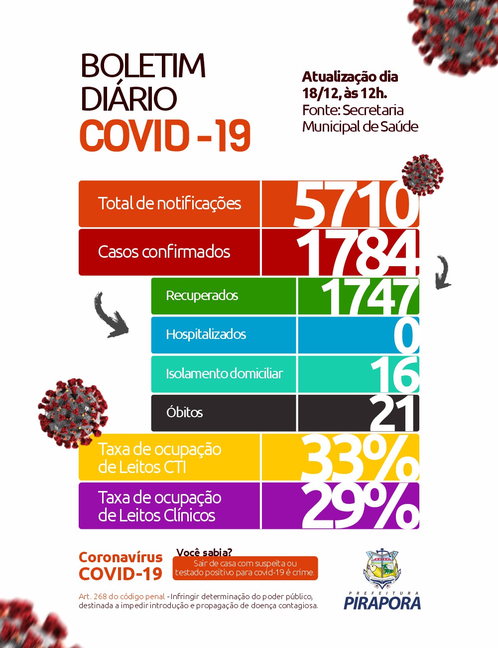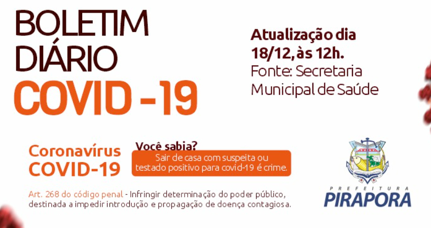 O Comitê Técnico de Enfrentamento da Covid-19 de Pirapora divulga o boletim desta sexta-feira (18/12), com 24 casos que testaram positivo para coronavírus. São 16 homens e 08 mulheres.