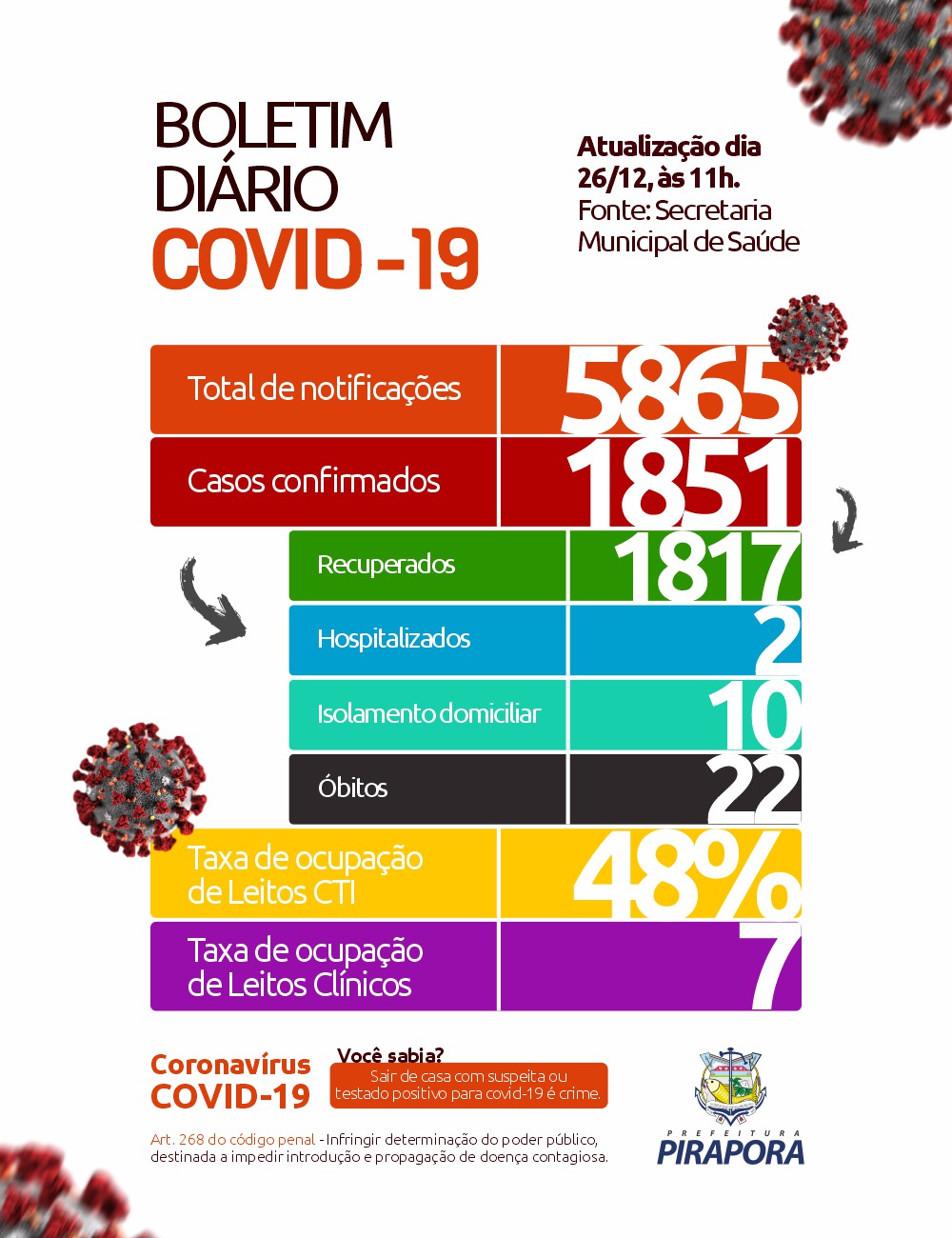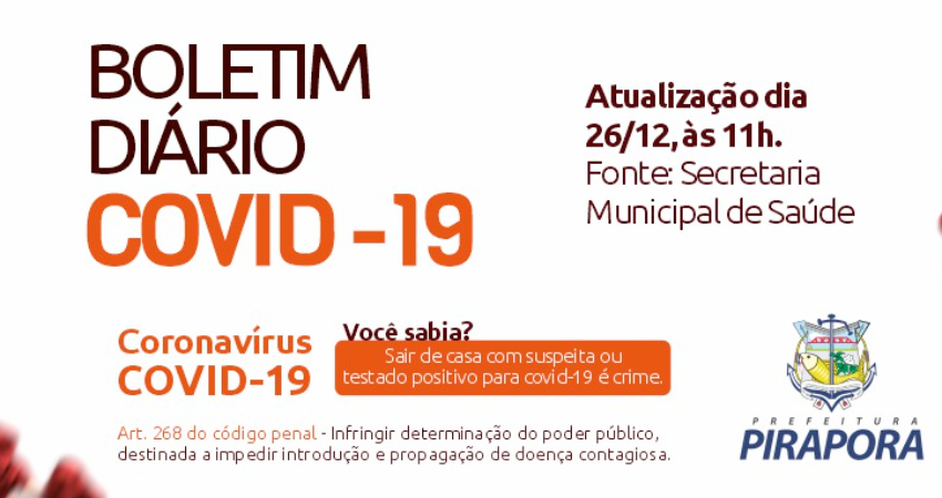 O Comitê Técnico de Enfrentamento da Covid-19 de Pirapora divulga o boletim deste sábado (26/12), com 04 casos confirmados para a covid-19. São 03 mulheres e 01 homem, com idade entre 22 a 56 anos.