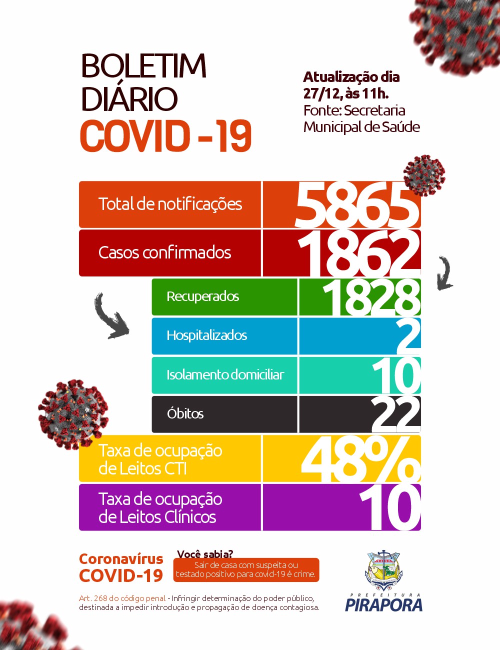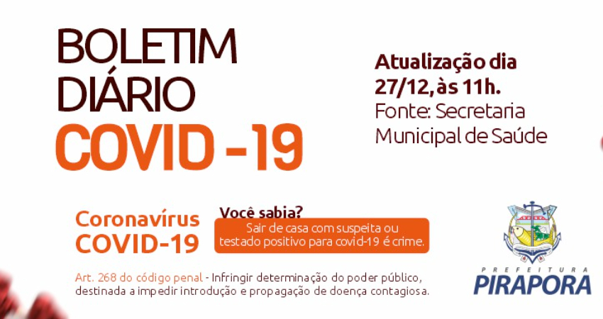 O Comitê Técnico de Enfrentamento da Covid-19 de Pirapora divulga o boletim deste domingo (27/12), com 11 casos confirmados para a covid-19. São 08 mulheres e 03 homens, com idade entre 14 a 61 anos.