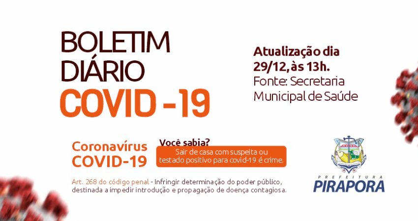 O Comitê Técnico de Enfrentamento da Covid-19 de Pirapora divulga o boletim desta terça-feira (29/12), com 07 casos confirmados para a covid-19. São 05 mulheres e 02 homens, com idade entre 19 a 75 anos.