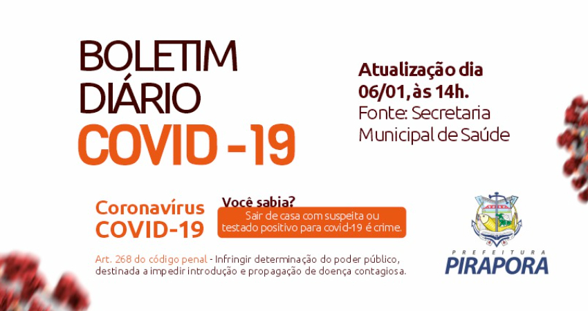 O Comitê Técnico de Enfrentamento da Covid-19 de Pirapora divulga o boletim desta quarta-feira (06/01), com 18 casos confirmados para a covid-19. São 10 homens e 08 mulheres, com idade entre 08 a 75 anos.