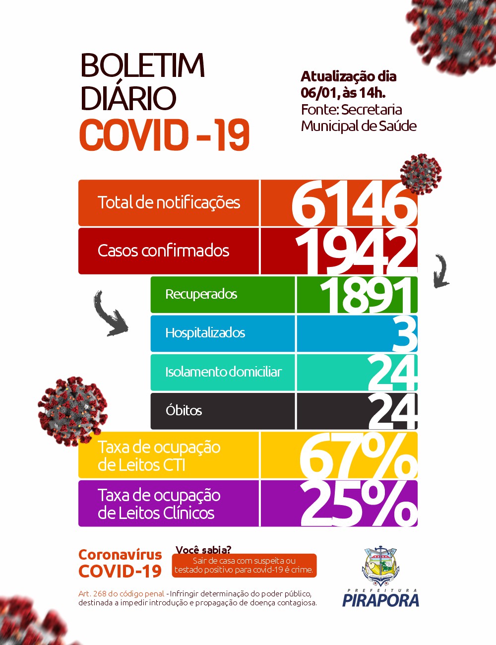 O Comitê Técnico de Enfrentamento da Covid-19 de Pirapora divulga o boletim desta quarta-feira (06/01), com 18 casos confirmados para a covid-19. São 10 homens e 08 mulheres, com idade entre 08 a 75 anos.