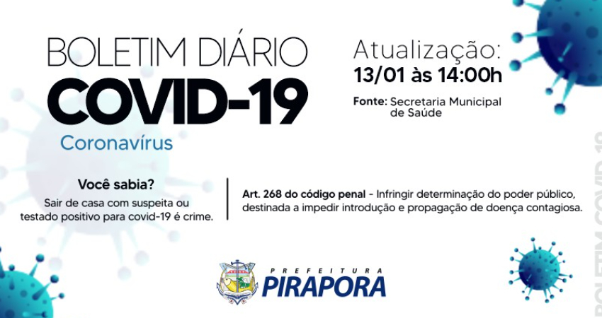 O Comitê Técnico de Enfrentamento da Covid-19 de Pirapora divulga o boletim desta quarta-feira (13/01), com 16 casos confirmados para Covid-19. São 09 mulheres e 07 homens, com idade entre 15 a 67 anos.