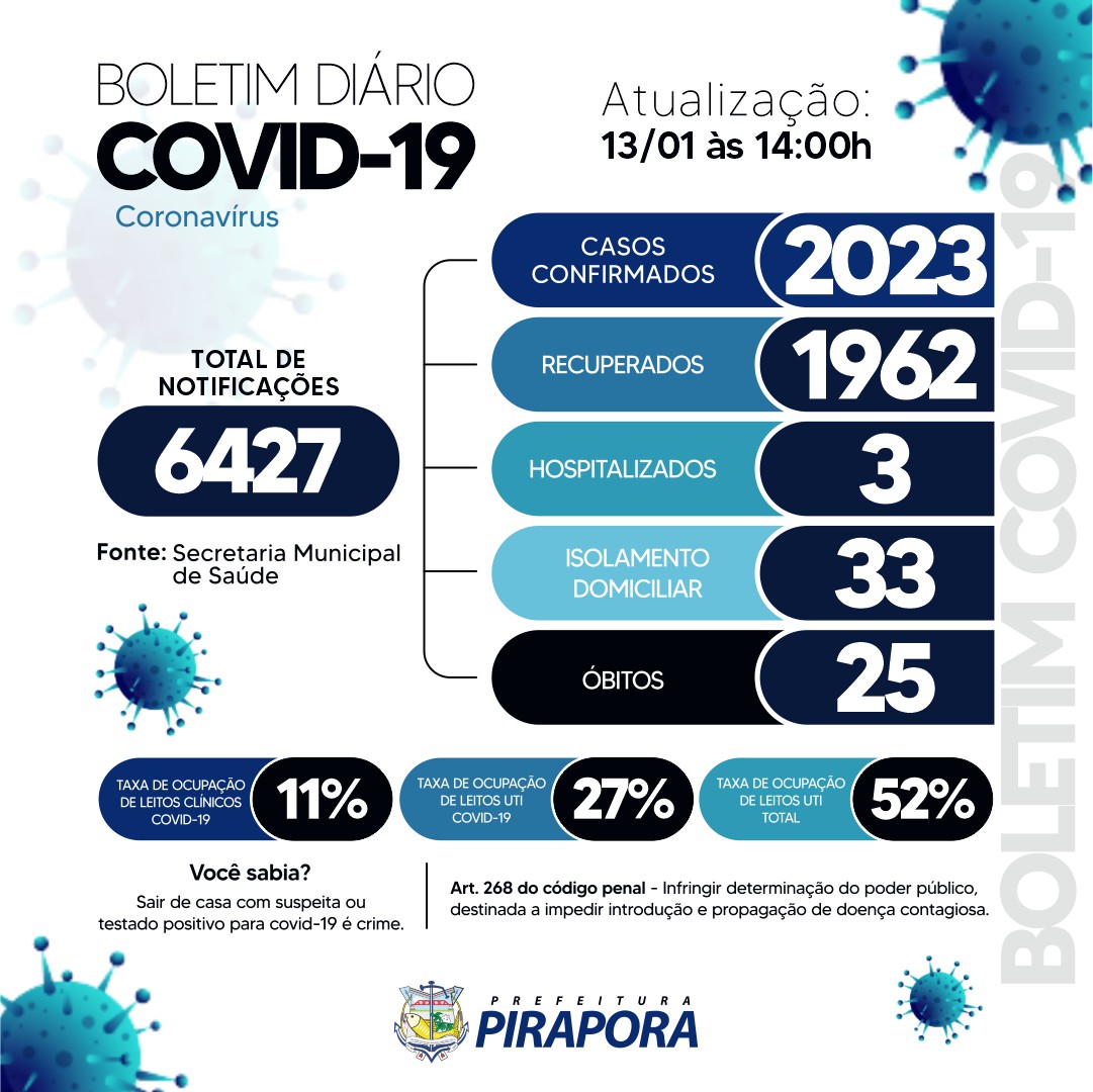O Comitê Técnico de Enfrentamento da Covid-19 de Pirapora divulga o boletim desta quarta-feira (13/01), com 16 casos confirmados para Covid-19. São 09 mulheres e 07 homens, com idade entre 15 a 67 anos.