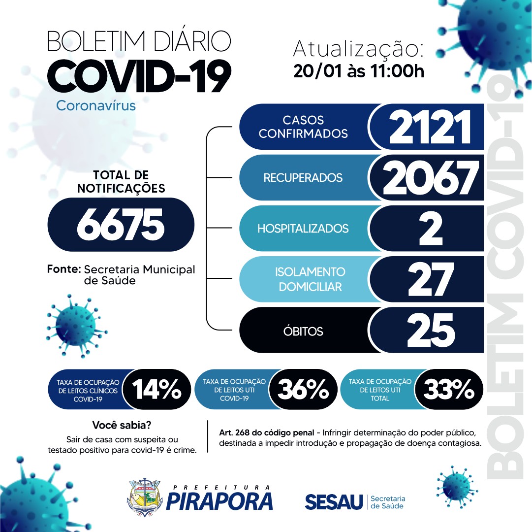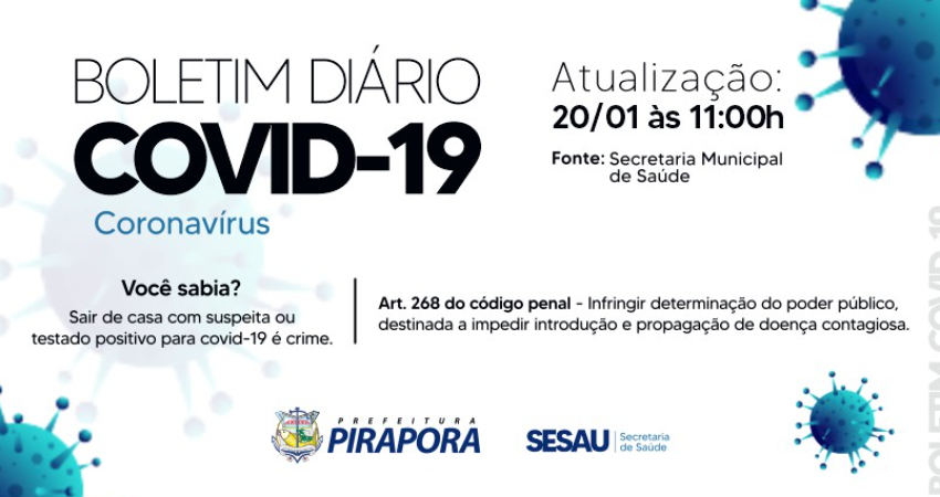O Comitê Técnico de Enfrentamento da Covid-19 de Pirapora divulga o boletim desta quarta-feira (20/01), com 29 casos confirmados, sendo 19 mulheres e 10 homens, com idade entre 10 a 53 anos.