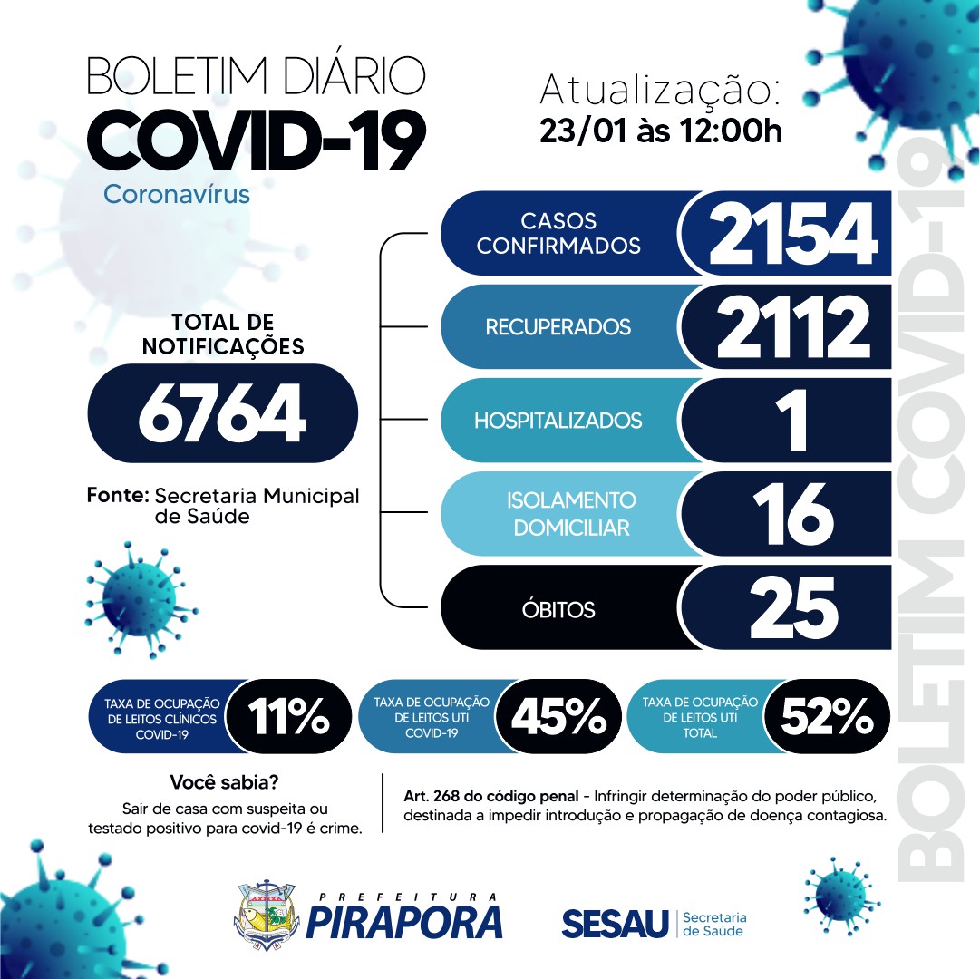 O Comitê Técnico de Enfrentamento da Covid-19 de Pirapora divulga o boletim desta sábado (23/01), com 15 casos confirmados para covid-19, sendo 10 mulheres homens e 05 homens, com idade entre 21 meses a 46 anos.