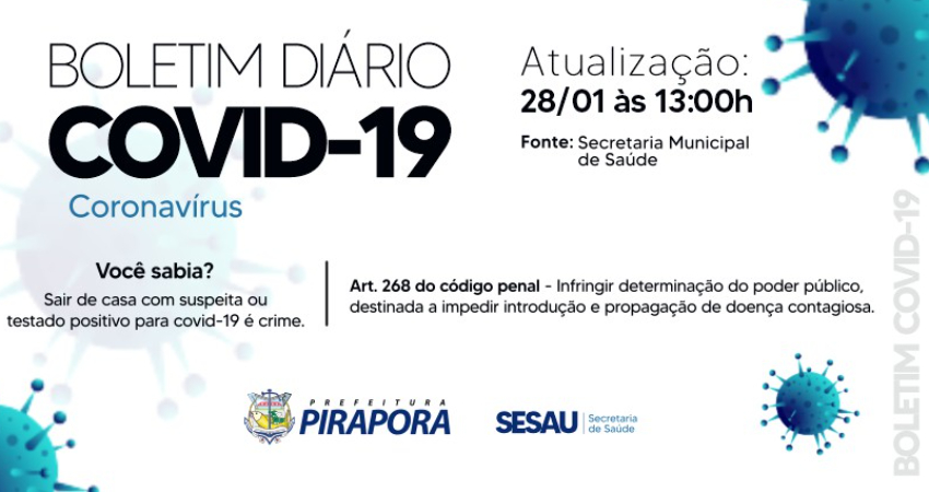 O Comitê Técnico de Enfrentamento da Covid-19 de Pirapora divulga o boletim desta quinta-feira (28/01), com 16 casos positivos para covid-19. São 10 homens e 06 mulheres, com idade entre 10 a 80 anos.