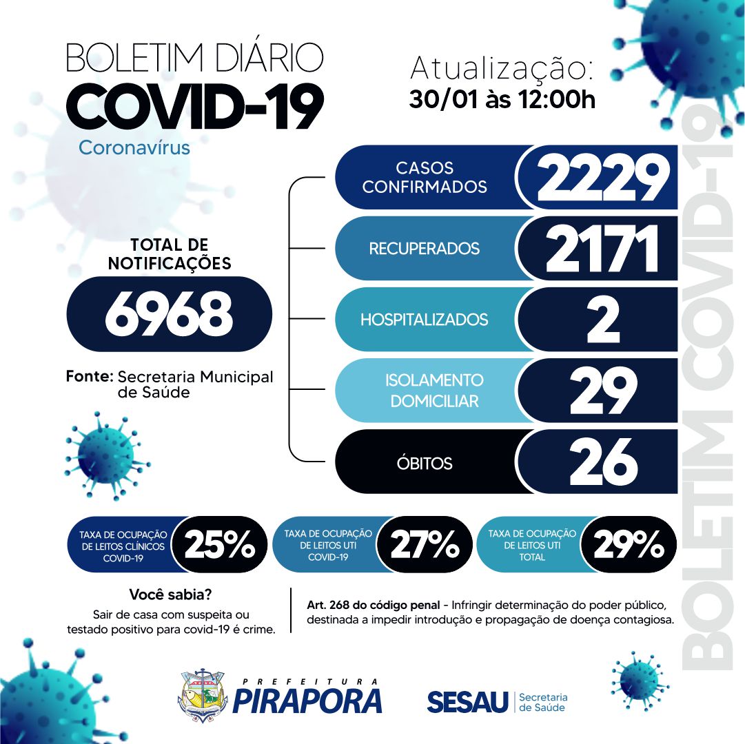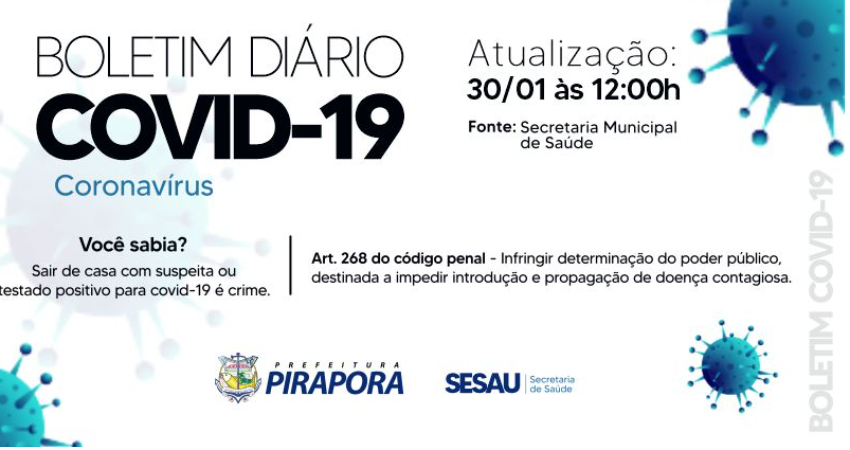 O Comitê Técnico de Enfrentamento da Covid-19 de Pirapora divulga o boletim desta sábado (30/01), com 15 casos positivos para covid-19. São 08 homens e 07 mulheres.