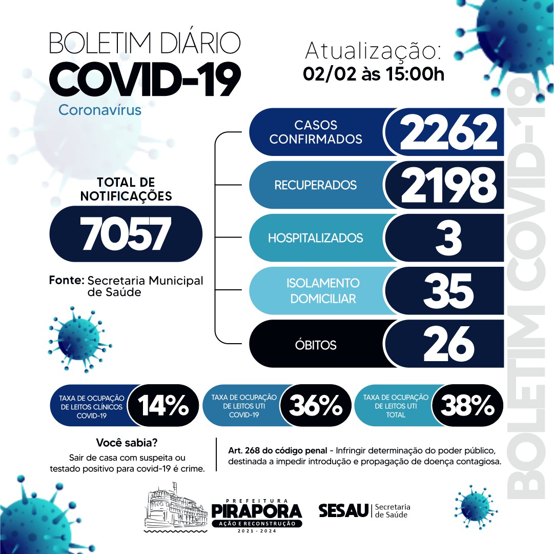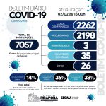 O boletim completo atualiza em 7.057 casos notificados, 2.262 casos confirmados, com 35 em isolamento e monitoramento, 2.198 recuperados, 03 hospitalizados e 26 óbitos.