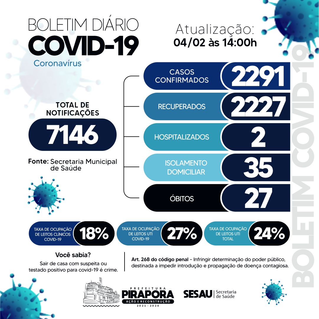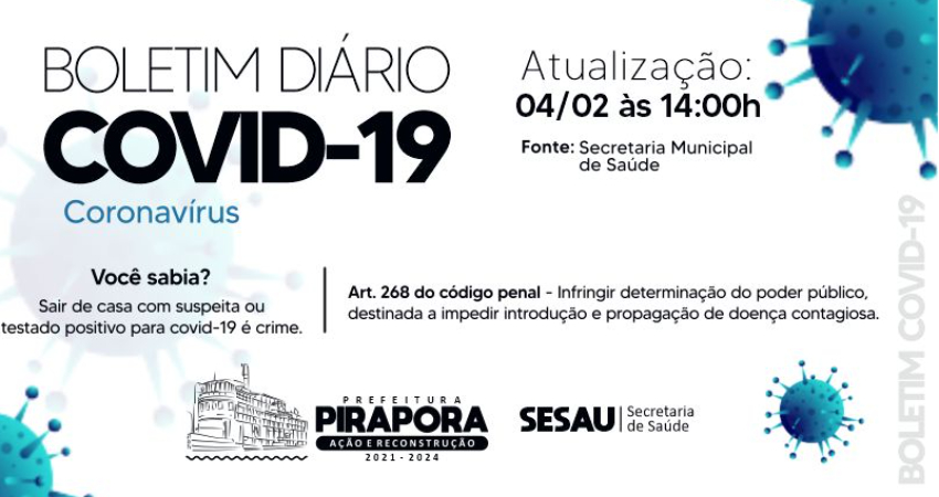 O Comitê Técnico de Enfrentamento da Covid-19 de Pirapora divulga o boletim desta quinta-feira (04/02), com 14 casos positivos para covid-19. São 09 mulheres e 05 homens, com idade entre 26 a 74 anos.